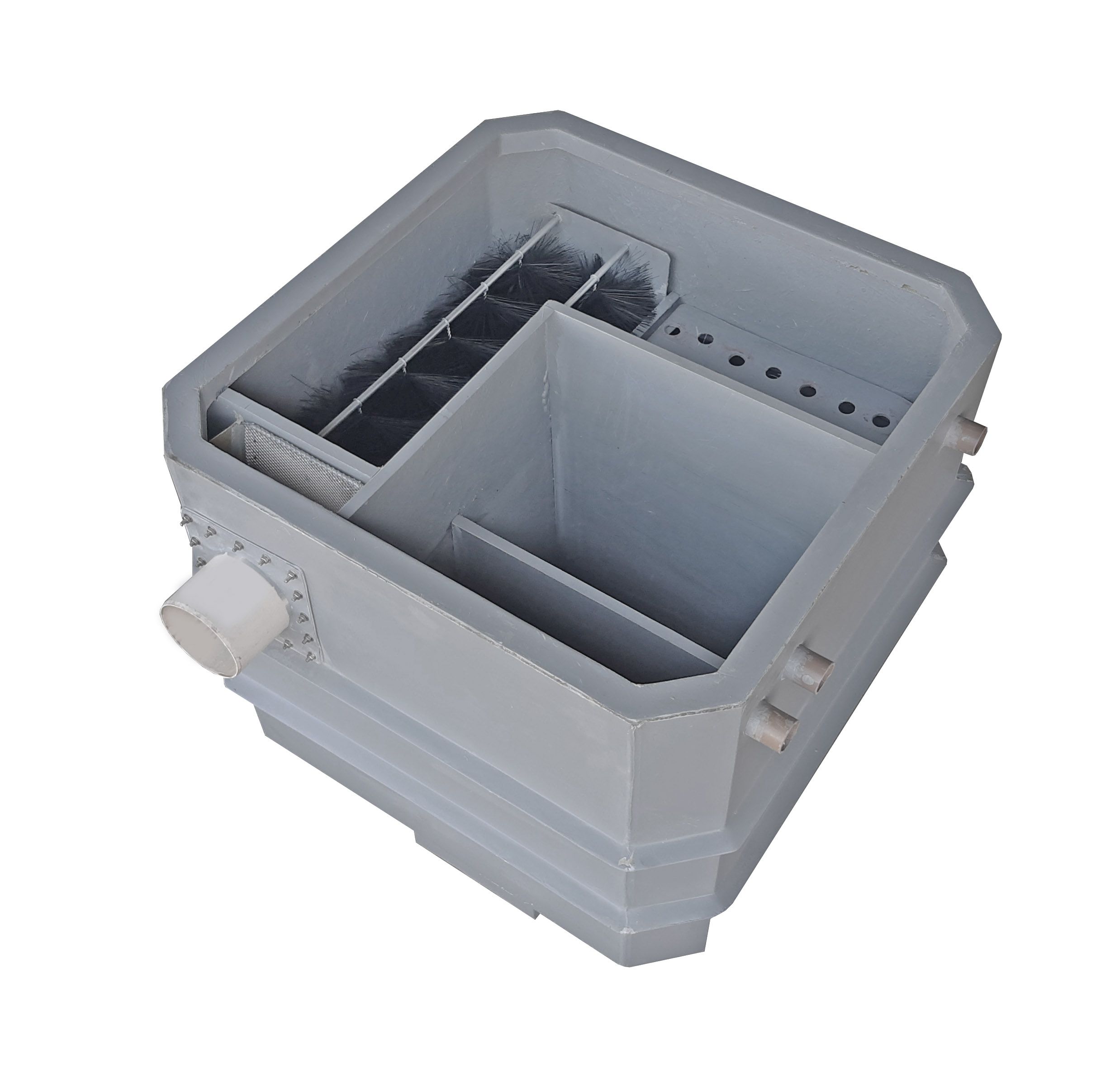 Filtro versátil de fibra de vidro para lagos com diversos revestimentos, operando por vasos comunicantes e adaptável para uso com pedras naturais, lona ou cimento. Pode ser configurado como filtro por gravidade, camuflado na cascata, ou instalado remotamente com skimmers. Destaca-se por eficiente filtração física e biológica, com uma SSA de 3000 m²/m³.