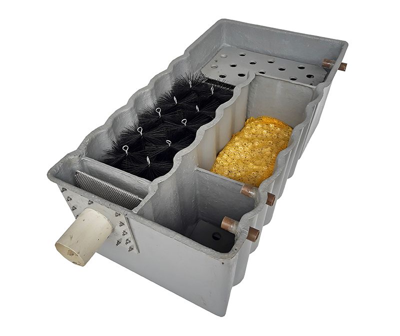 Filtro de 7.000 Litros para lagos, feito de fibra de vidro, versátil e eficiente em diversos revestimento.Opera por vasos comunicantes, com a bomba protegida no último compartimento, enviando água limpa para cascata e retornando ao lago. pode ser configurado como filtro por gravidade, com a bomba no lago eo filltro camuflado na cascata. Destaca-se por eficiente filtração fisica e biologia, SSA de 2000 m² \ m³.